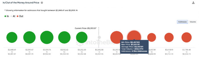 以太基基金的持續流出反映了負面的技術背景。以太幣最近的復蘇嘗試因3500美元以上的供應擁堵而被拒絕,這表明該區域是ETH復蘇之路上的重要障礙。IntoTheBlock的數據強化了該阻力區的重要性。其In/Out of the Money around Price (IOMAP)模型顯示,該區域價格范圍為3457美元至3557美元,其中418萬個地址購買了約193萬個ETH。