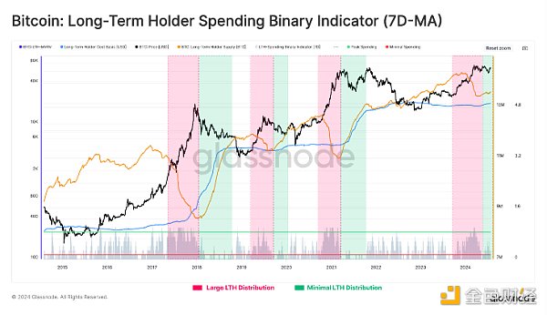 最后,我們可以利用長期持有者(LTH)二元支出指標來描繪持有者分配壓力強度并將其可視化。