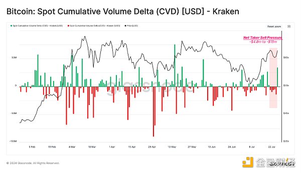了解到Kraken和Bitstamp都是這些再分配Tokens的目標交易所,我們可以利用現貨累積交易量增量(CVD)指標來為這一想法增添更多色彩。