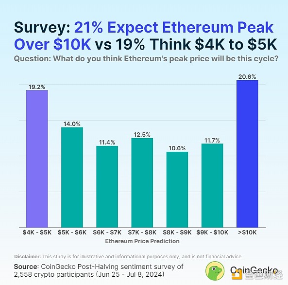 與Bitcoin不同,crypto參與者對Ethereum價格的預期相當復雜。20.6% 的受訪者預測Ethereum將在本輪周期內(nèi)達到 10,000 美元以上的峰值,這是最受歡迎的觀點,但差距很小。另一方面,19.2% 的人預測Ethereum這次最多只能達到 5,000 美元。