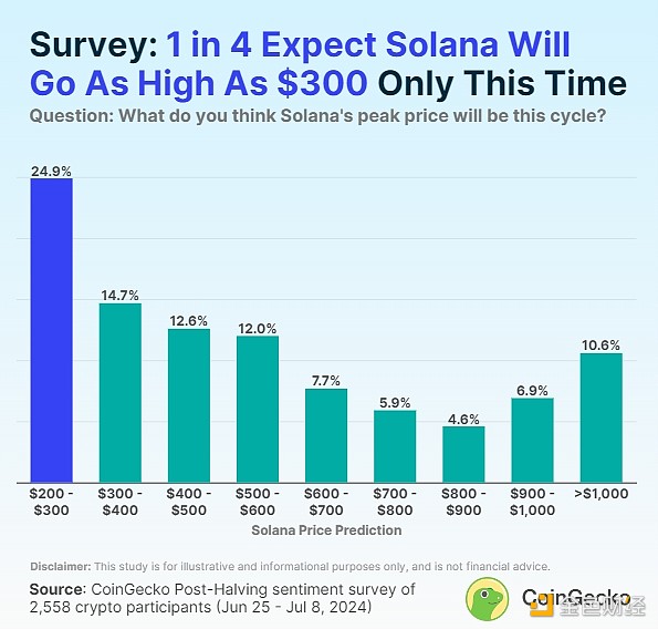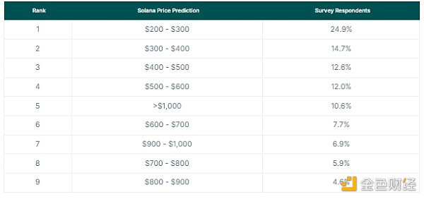 與Bitcoin相比,crypto參與者對 Solana 的潛在價格上漲持較為保守的看法。調查發(fā)現(xiàn),24.9% 的crypto參與者預計 Solana 本周期的價格只會升至 300 美元,這成為Ethereum競爭對手最受歡迎的預測。換句話說,這些參與者并不認為 Solana 的價格會大幅高于上一輪牛市創(chuàng)下的歷史最高價。